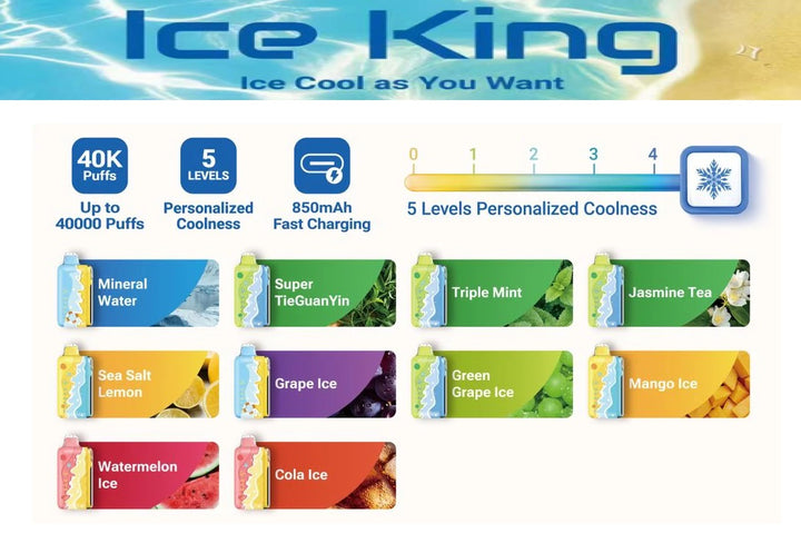 Equipped with a rechargeable high-capacity battery and USB-C fast charging, the Ice King ensures long-lasting use with minimal downtime. Its dual vaping modes allow you to choose between Regular Mode for extended puffs or Turbo Mode for richer flavor and denser clouds.